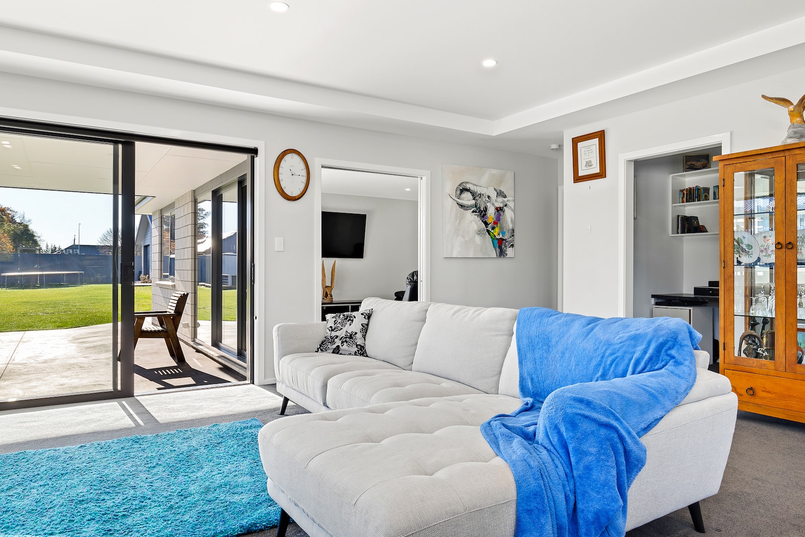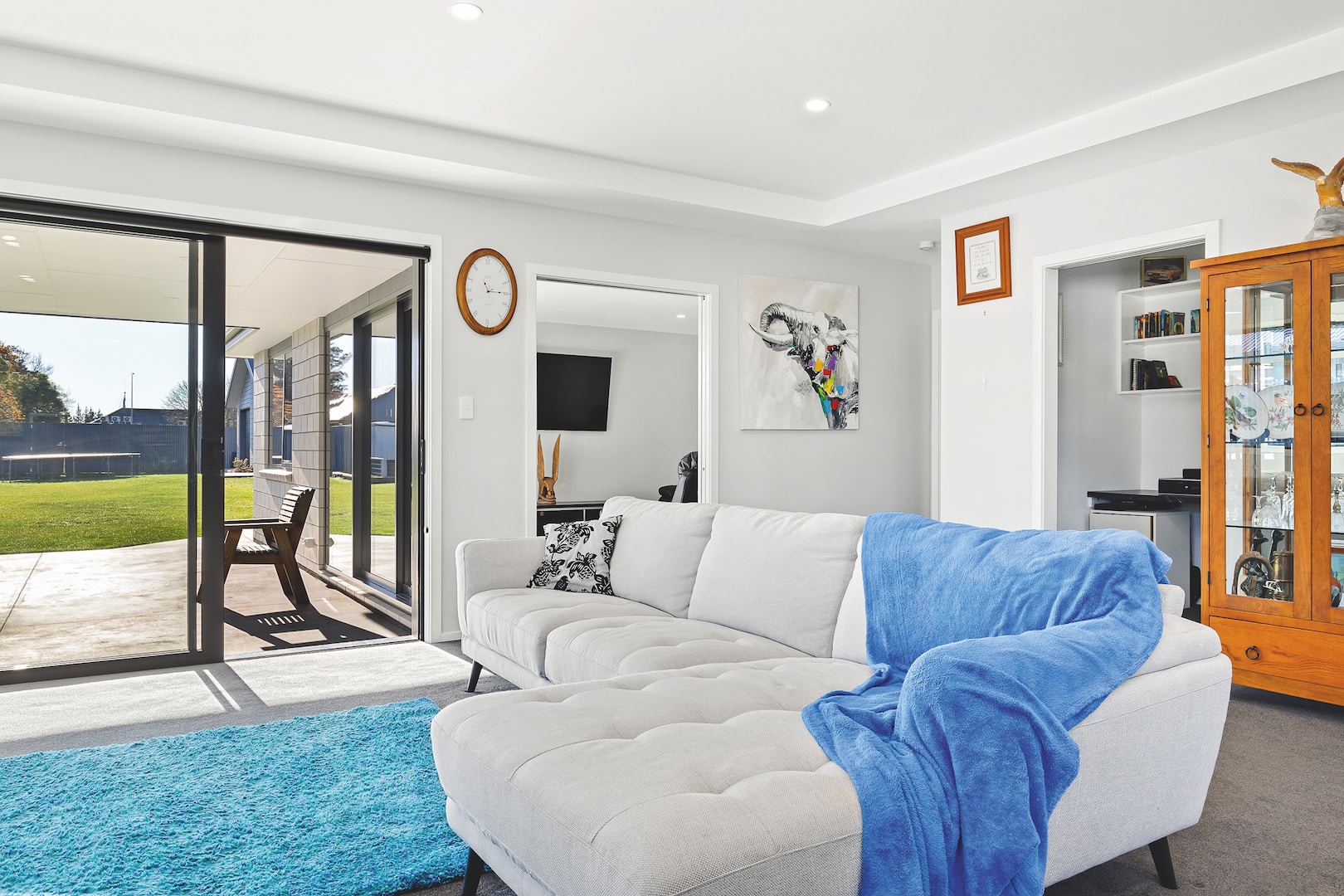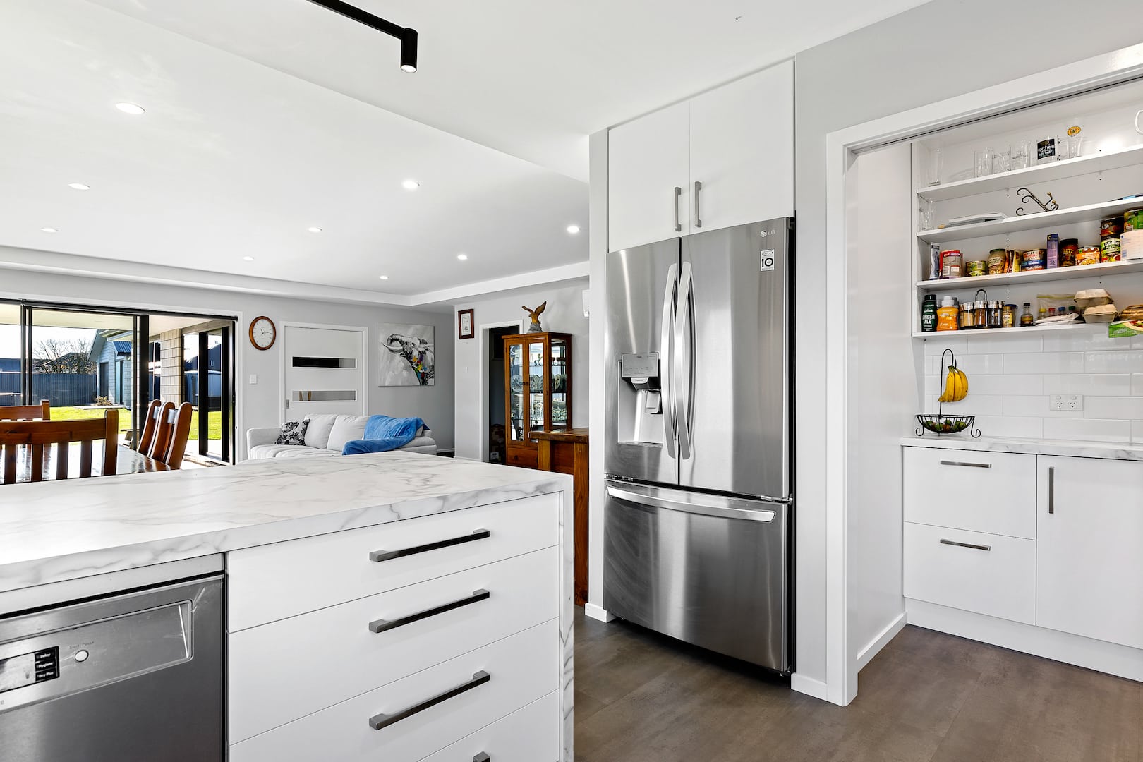 The entry leads into an open-plan living and kitchen zone with views to the street and a scullery that delivers plenty of storage and bench space. A raised ceiling in the dining-living room defines the space, which opens onto a covered patio.
